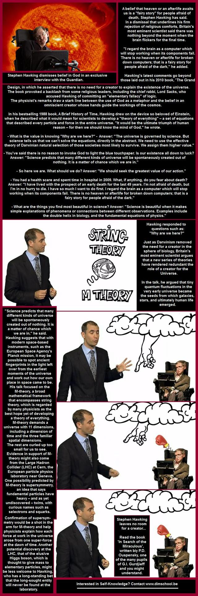 Voor de Eclecticus: Tracht al hetgeen G. I. Gurdjieff ons trachtte mede te delen te be-grijp-en en dan zul je tot het inzicht komen dat ook een Stephen Hawking 100% gelijk kan hebben. Denk dan vooral ook aan het metafoor van de olifant en de 7 blinden... - en, verwar het Absolute niet met de een of andere denkbeeldige godheid, hé! :-)