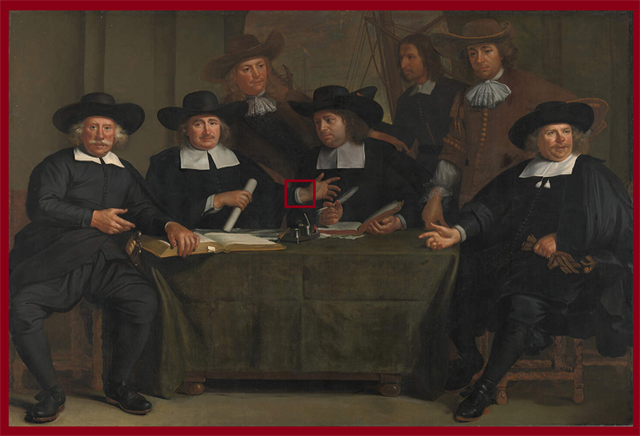 Tijdens een routineconditieonderzoek van een 17de-eeuwse groepsportret in de collectie van het Amsterdam Museum ontdekte restaurator Liesbeth Abraham een onverwachte tatoeage: op de binnenkant van de linkerpols van een van de vier afgebeelde heren prijkt een grijsblauwe, achtpuntige ster met staart. Het werk uit 1674, getiteld ‘De oppercommissarissen der Walen’, toegeschreven aan Wallerant Vaillant, meet ongeveer twee bij drie meter. Door het ostentatief armgebaar van één van de afgebeelde personen komt de tatoeage midden in de compositie te staan en valt ze daarom direct op. We komen er onmiddelijk op terug. Eerst dit...