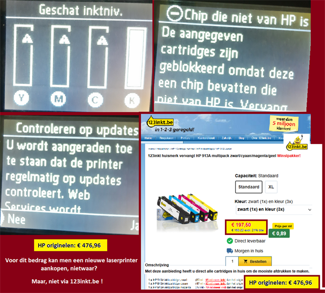 Toners, die praktisch nooit werden gebruikt, werden als leeg aangeduid. De cartridges werden geblokkeerd en het aankoopbedrag van de HP originelen is niet langer te verantwoorden. Hetzelfde geldt om voor toekomstige bestellingen nog voor 123inkt.be te kiezen.