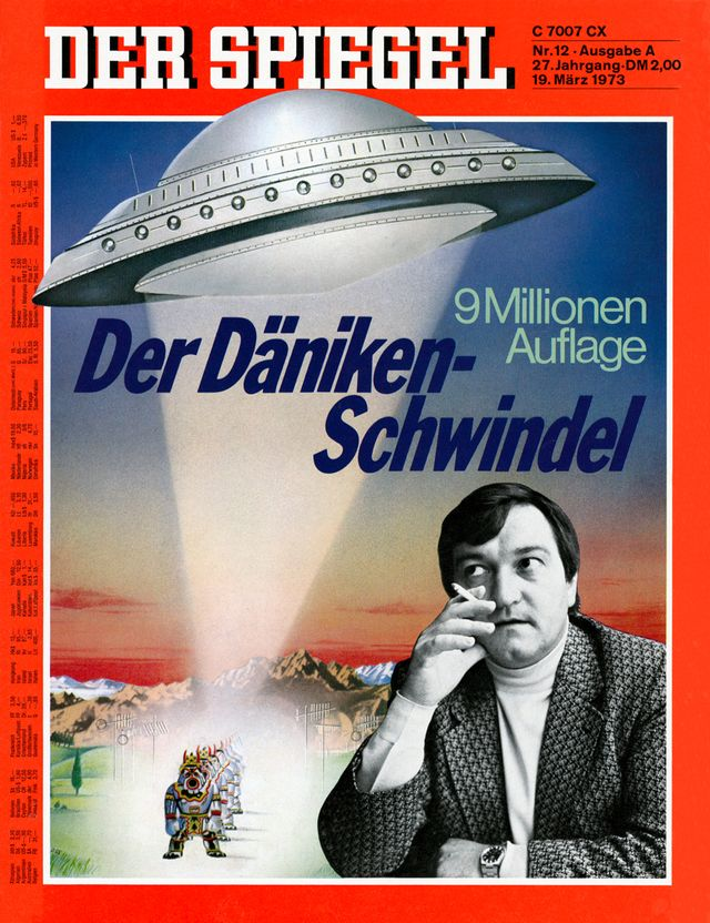 Op de cover van zijn boek verscheen een rotstekening van een man met een hoofdtooi die wat leek op het vizier van een astronautenhelm. Miljoenen lezers krabden zich erover achter hun oren.