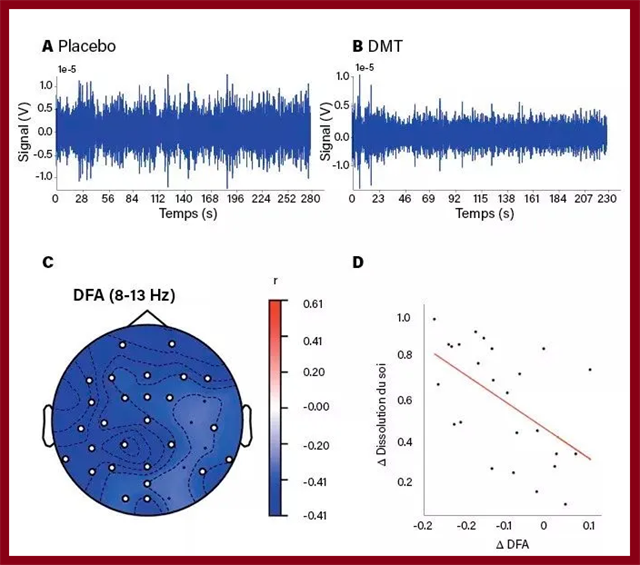 Onder invloed van DMT (boven rechts) is het EEG‑signaal in de alfa-frequentieband (8–13 hertz) zwakker en homogener dan onder een placebo (boven links). Dat wijst erop dat de hersenen minder georganiseerd zijn: de neuronale synchronisatie die hersengolven voortbrengt, is geringer, en de activiteit wordt minder beïnvloed door haar verleden. Het signaal lijkt meer op ruis, met snelle, willekeurige schommelingen van kleine amplitude. De mate waarin zulke schommelingen afhangen van eerdere toestanden (de temporele correlatie) kan worden gemeten met indices zoals DFA. Die index, berekend per elektrode, daalt vrijwel overal (volle cirkels onder links), een teken dat de hersengolven chaotischer worden. En hoe sterker die daling, hoe intenser het zelfverlies (grafiek onder rechts).