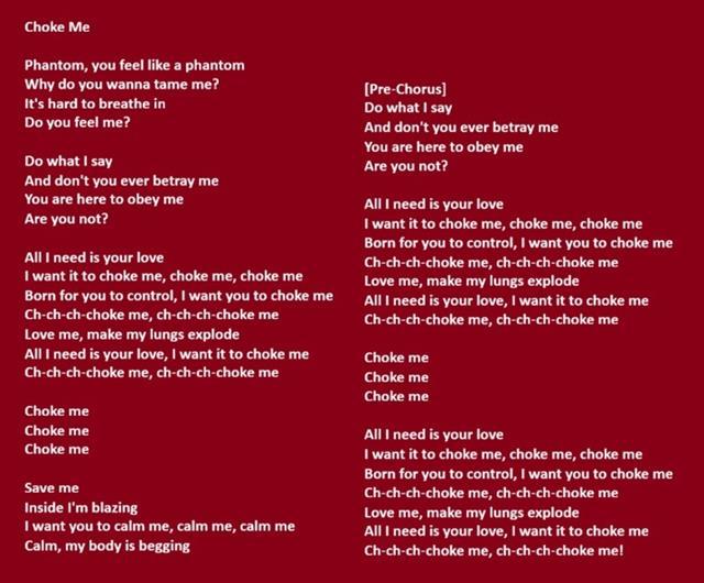 'Choke Me' verwijst naar het wanhopige verlangen naar een allesoverheersende instinctieve vorm van 'liefde'. Het gaat over dat rauwe en angstige behoefte om alles tegelijk te voelen, zelfs als dat betekent dat men de adem erbij verliest. De zangeres uit een innerlijk brandend vuur dat alleen door een partner kan worden getemd die de volledige controle over haar neemt. Het nummer illustreert de dunne grens tussen passie en gevaar, waar bestiale liefde zwaar genoeg aanvoelt om zelfs de longen te laten ontploffen. Kortom: bij velen doet het misschien aan wurgseks denken... :-)