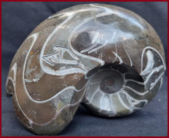 Prachtige goniatiet met een uiterlijk dat te danken is aan de mineralen die er tijdens het miljoenen jaren durende fossilisatieproces zijn ingetrokken. Volledig natuurlijk en een uniek stuk, enkel gepolijst om de mooiste kleuren en tekeningen naar voren te laten komen.