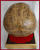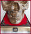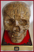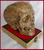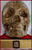 Een meesterlijke Memento Mori Vanity, getiteld 'A Golden Artist', geproduceerd door kunstenaar Ried Gould. Deze levensgrote harsschedel is bedekt met oude muziekpartituren, vervolgens verweerd en voorzien van een satijnvernis afwerking. In de bovenkaak is er een opmerkelijke gouden tand te zien. Tussen haakjes: daarvoor moest zogezegd de 'echte tand' worden verwijderd, en die bevindt zich in het kastje onderaan. Na ontvangst van dit museumstuk zal je wel merken wat ik bedoel. :-) De schedel is bevestigd op een vergulde houten basis, bedekt met rood fluweel en vier bronzen hoeken en een satijnen draad rond de rand. De onderzijde is met zwart fluweel bekleed en heeft 4 koperen pootjes.