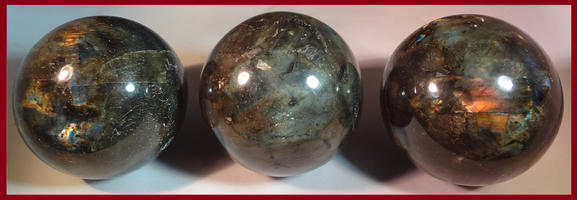 Labradoriet heeft een ijzersterke uitstraling en vertoont als iriserende siersteen een prachtig kleurenspel. Gelieve nota te nemen dat vanwege de belichting die echte kleuren en uitstraling niet voor 100 % konden worden weergegeven. Anders gezegd: in werkelijkheid zijn deze 3 Labradorieten veel, véél mooier. :-)