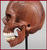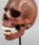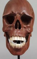 Met de hand vervaardigde replica van menselijke schedel met beweegbare onderkaak door bekwame Indonesische ambachtslieden uit hout vervaardigd, en achteraf op een op maat gemaakte metalen statief geplaatst. De tanden van de schedel zijn gemaakt van koeienbot en zijn zorgvuldig uitgesneden om er zo echt mogelijk uit te zien.