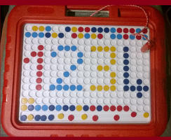Spelen... Met de Smoby kan men ook met z'n getweeën '3 op een Rij' spelen. Schud daarvoor de Magnetische Mozaïek eens goed door elkaar, totdat alle schijfjes in vakjes, of aan de zijkanten liggen. Plaats daarna alle schijfjes overzichtelijk, kleur bij kleur, naar een zijkant. Elk kind kiest één kleur of 2 kleuren uit. Bijvoorbeeld: Licht- en Donkerblauw versus Geel en Rood. Wie als eerste horizontaal, verticaal of diagonaal 3 schijfjes op een rij kan plaatsen, is de winnaar!